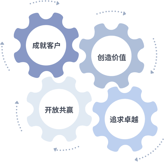 成就客户是一切决策的出发点,,,创造价值是衡量所有工作的标准,,,追求卓越是我们做事做人的态度,,开放共赢是我们的格局也是最终的结果。。。。价值观的齿轮环环相扣,,推动着组织里的每个人不断向前。。